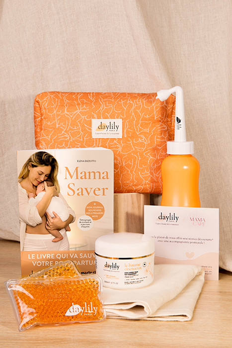 6 produits indispensables post-natals (bandeau peau à peau, gel chaud/froid, douchette intime, baume, livre, appel avec accompagnante)