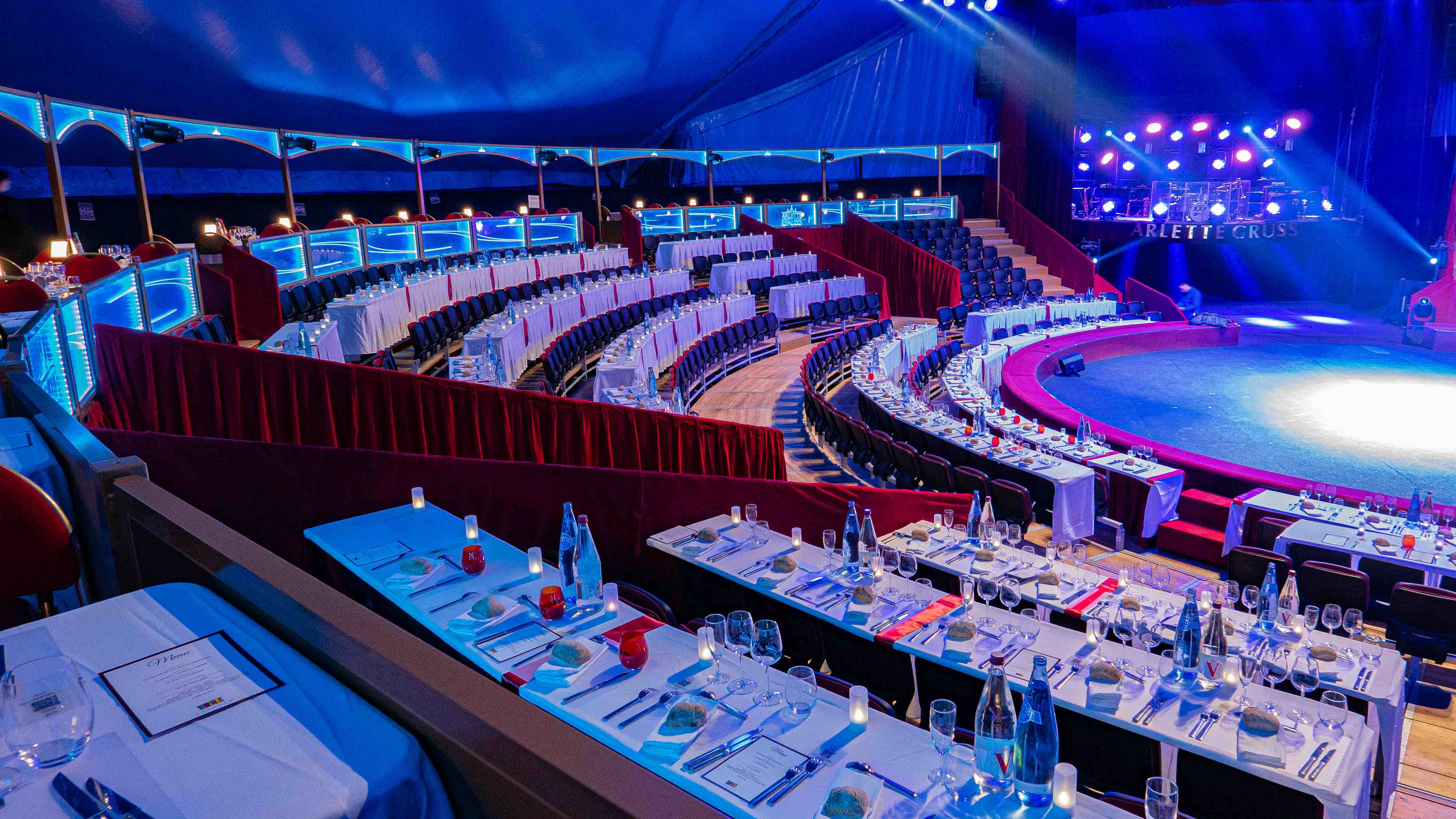 Notre chapiteau totalement repensé permet d’accueillir votre groupe dans les meilleures conditions de confort et de le plonger davantage dans l\’ambiance magique du cirque tout en dégustant des mets délicieux !