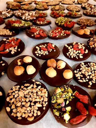 Bonbons fourrés (praliné maison, pâte d’amande, noix, menthe, fruits rouges, agrumes…)
